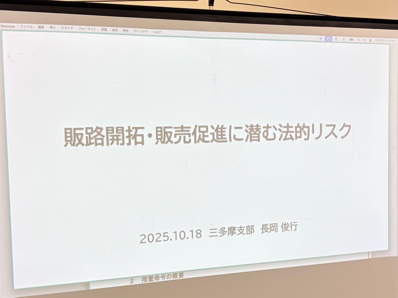 2025年10月18日(土)に、東京都中小企業診断士協会三多摩支部主催の「多摩の塾」で講師を担当いたしました。テーマは「販路開拓・販売促進に潜む法的リスク」です。